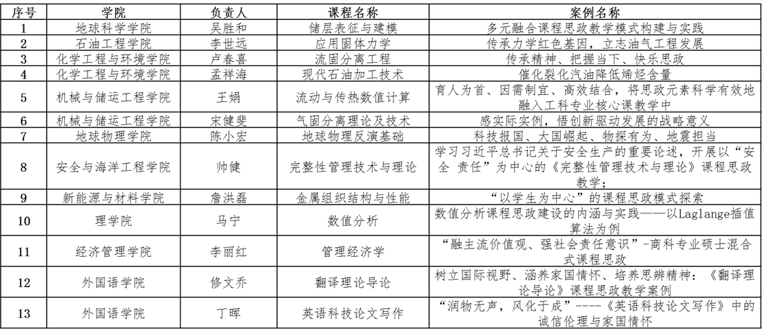 经课程主讲教师申请,学院评选推荐,研究生院资格审查,学校专家评审并公示,决定将“多元融合课程思政教学模式构建与实践”等13个案例评定为优秀研究生课程思政教学设计案例。名单如下: