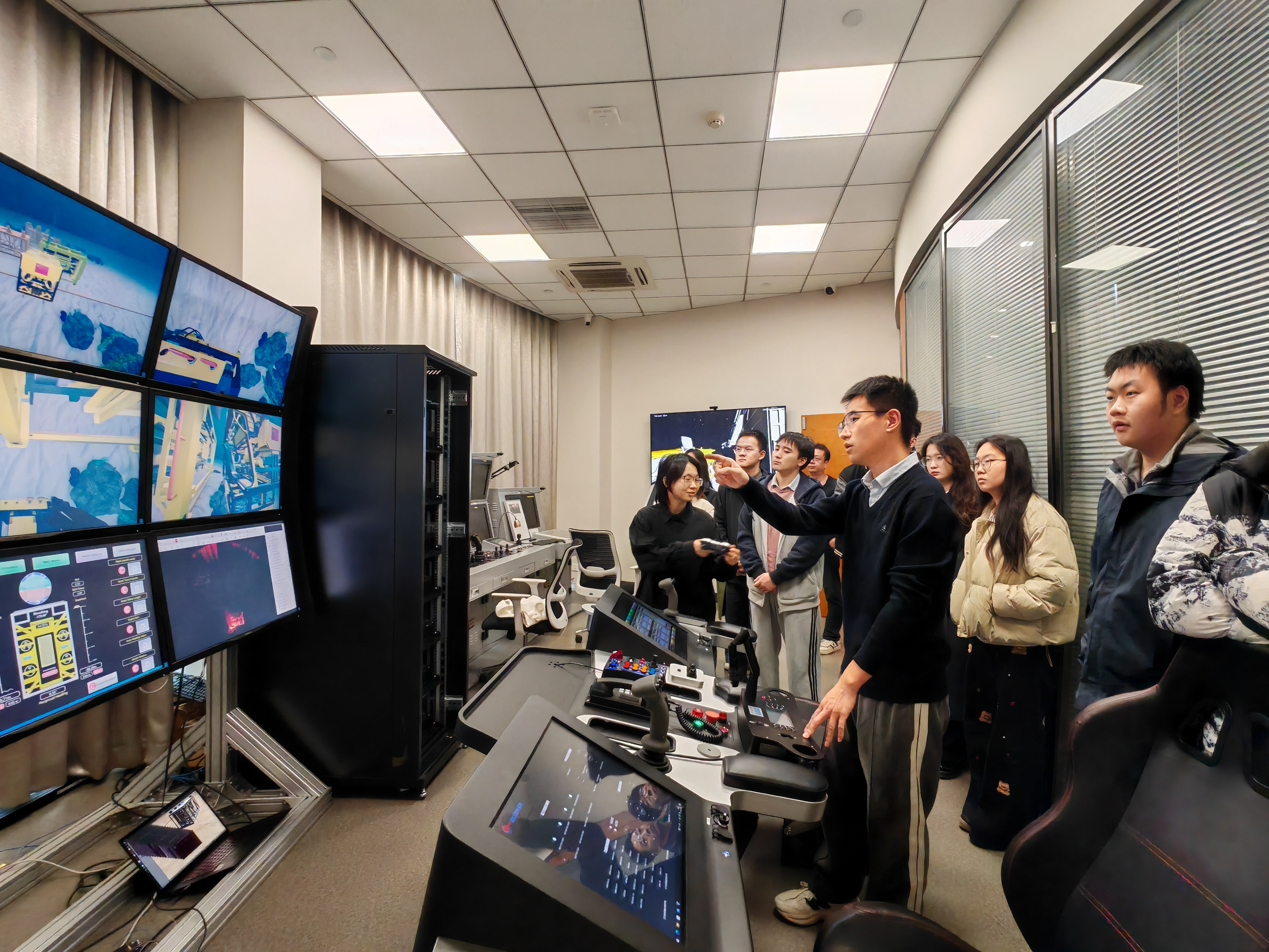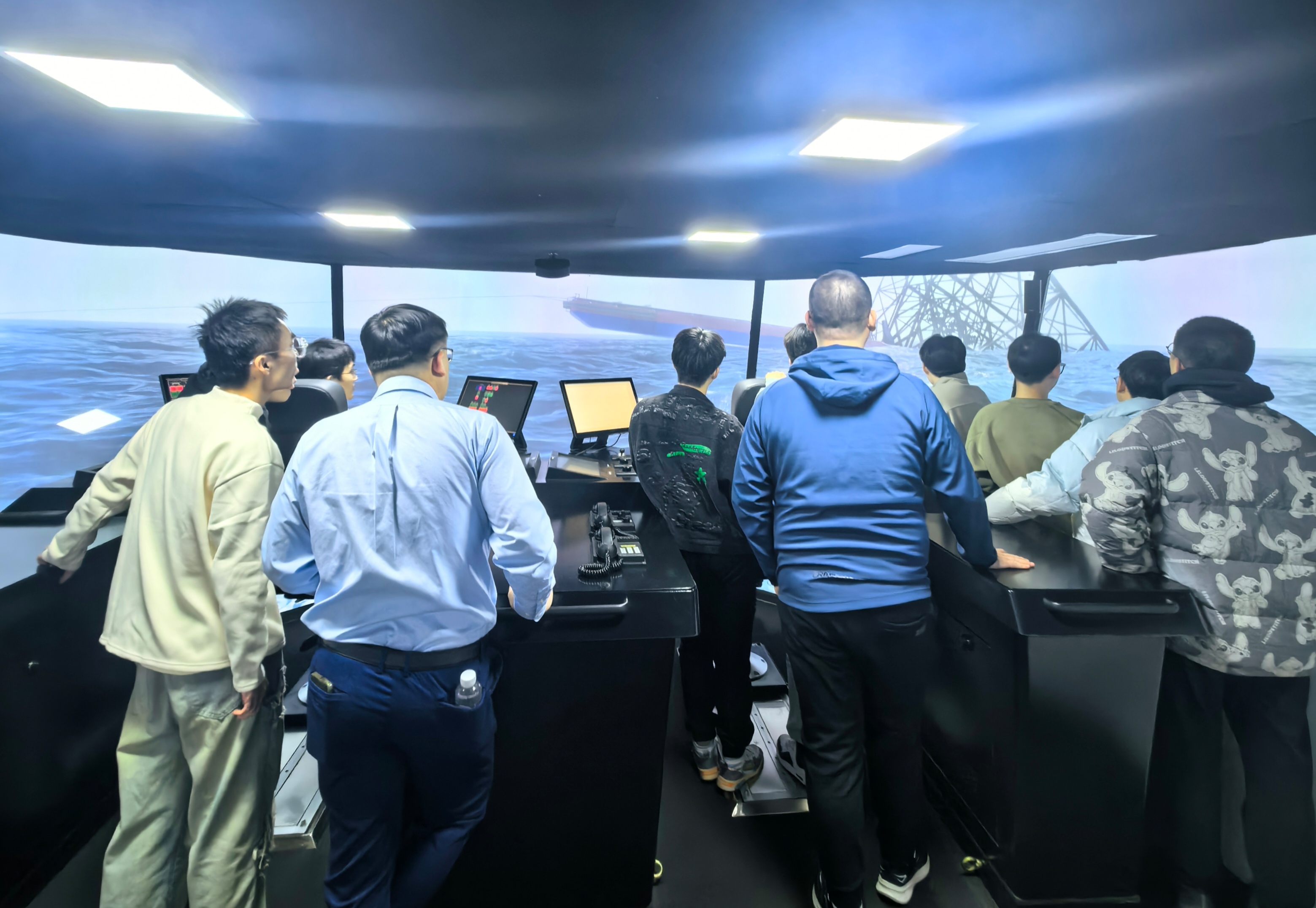 在海工大厦会议室,黄福祥为同学们带来了题为《数字仿真技术在海洋石油工程中的应用》的理论授课。随后,他带领同学们走进海洋工程数字化技术中心基地开展实地教学。在这里,同学们亲身体验了360°球幕视景显示系统、起重作业模拟器、拖轮作业仿真器、ROV协同作业仿真器等海洋工程作业仿真设备,直观了解了公司深水装备的设计应用与工程实施流程,进一步认识到数字化技术对海洋平台建设的深远意义。